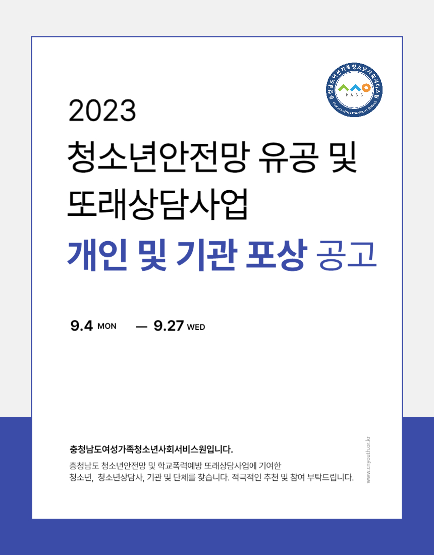 2023년 충청남도여성가족청소년사회서비스원 청소년상담복지센터에서는 다음과 같이 청소년안전망 및 학교폭력예방 또래상담사업에 기여한 유공자(기관) 포상하고자 하오니 적극적인 추천 및 참여 바랍니다.