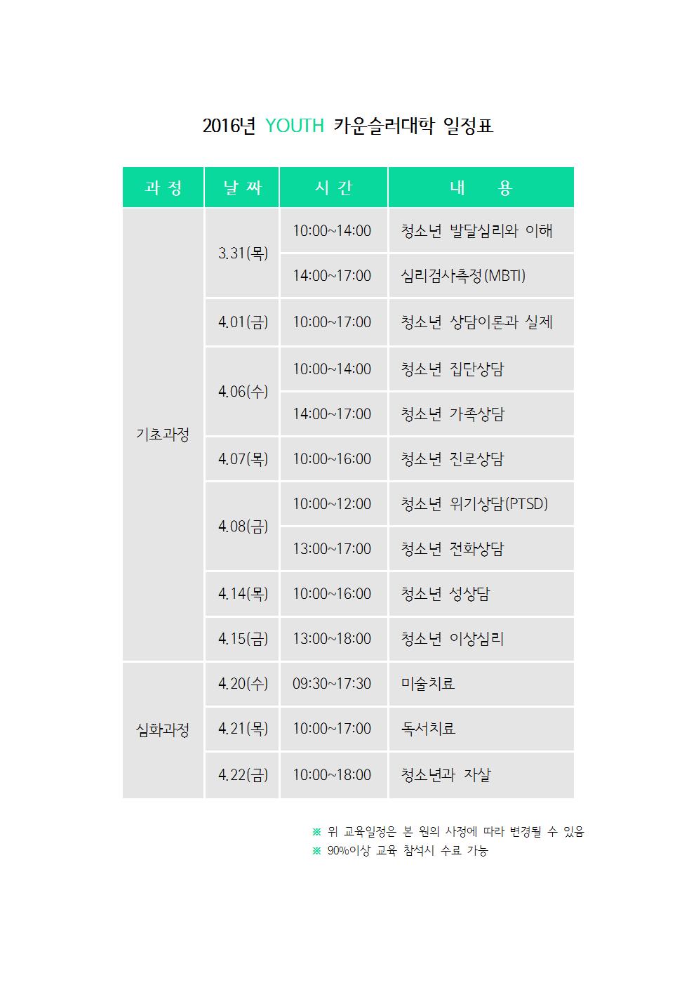 2016년 YOUTH 카운슬러대학 교육 안내문