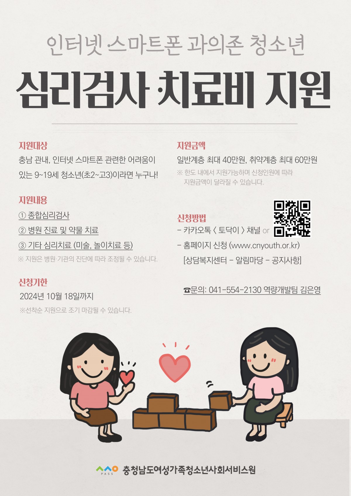 [모집]2024년 인터넷·스마트폰 과의존 청소년 심리검사 및 치료비 지원 안내