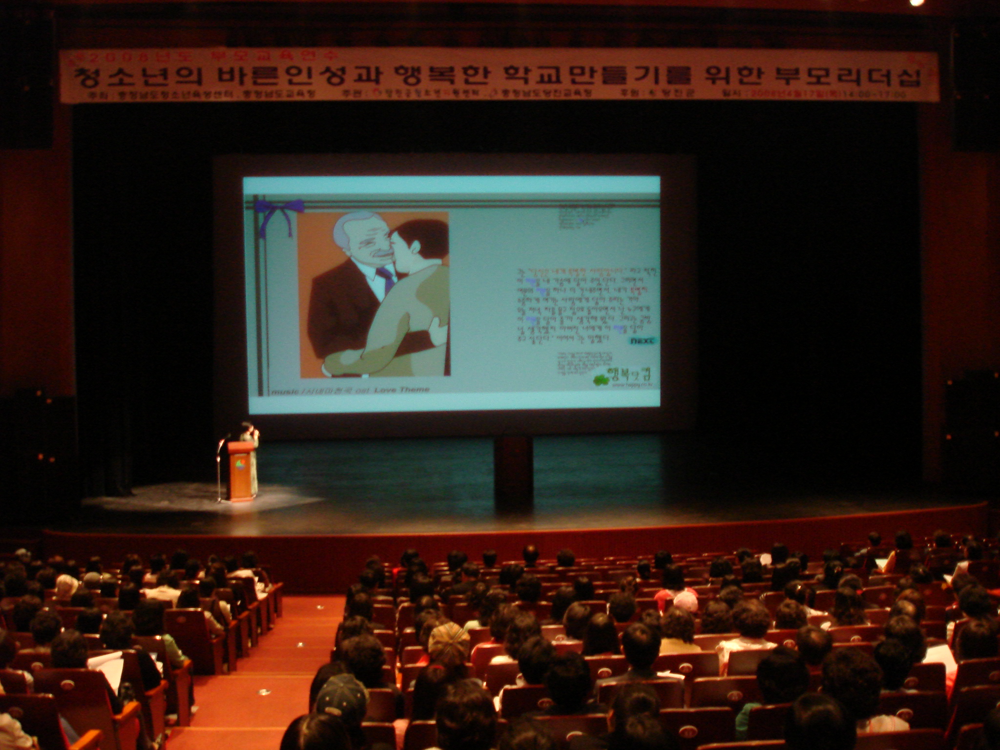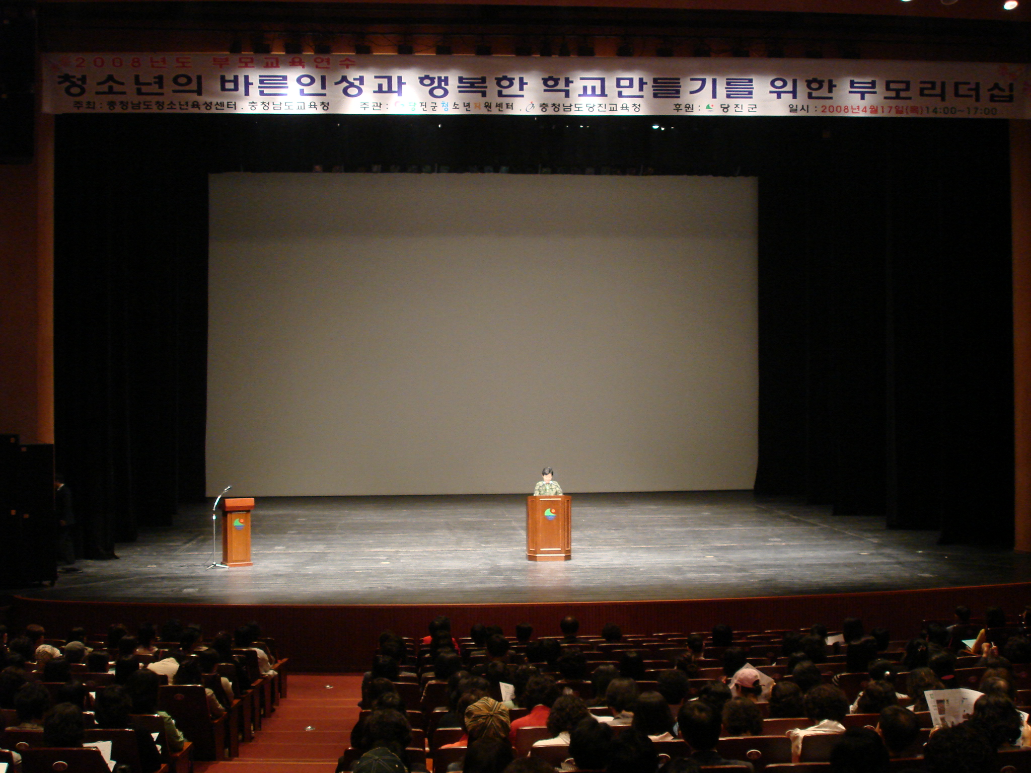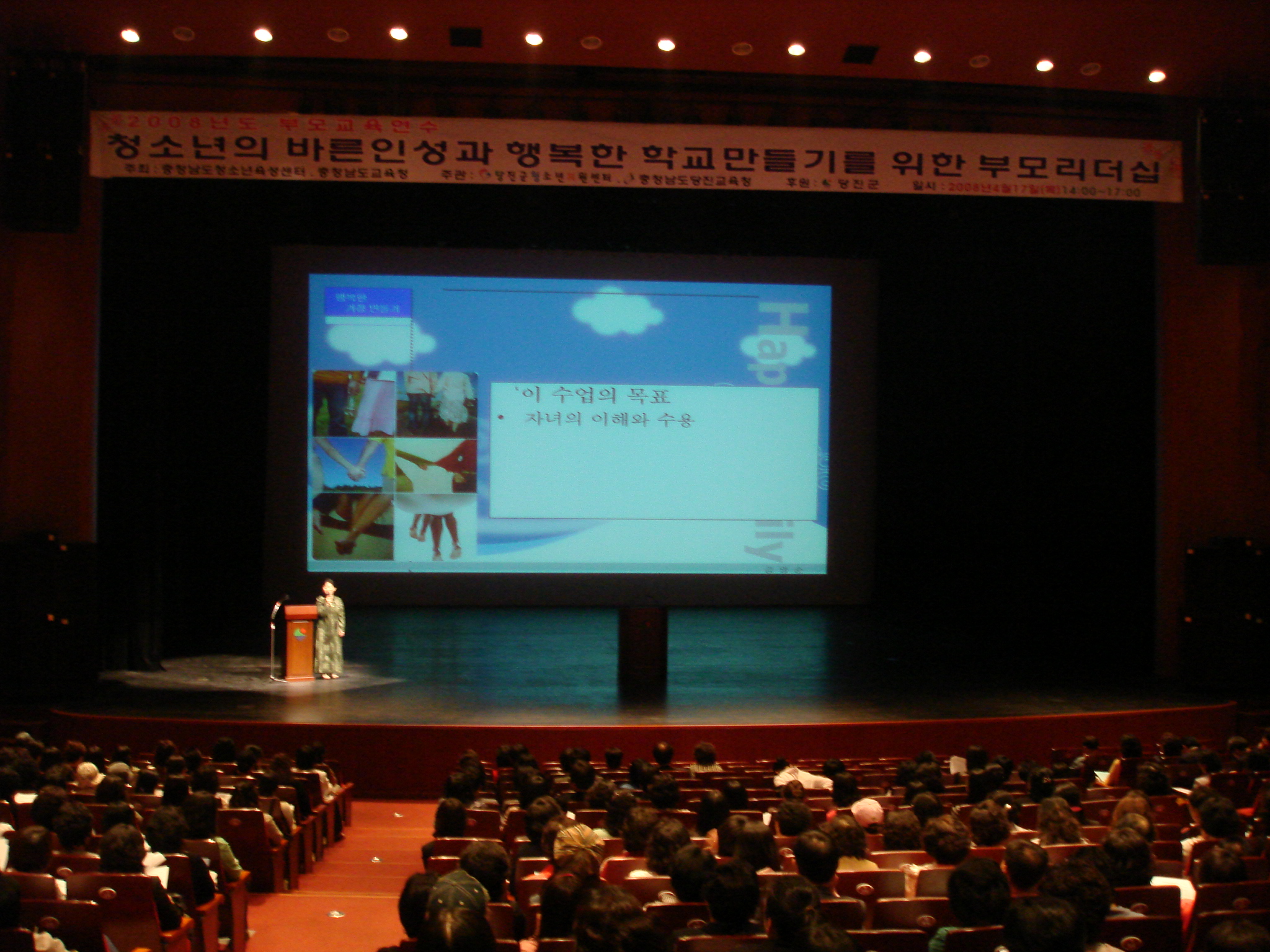 2008 대단위 부모교육 2722 | 최고관리자 | 2008-04-22 충청남도청소년육성센터 상담지원실에서 주최하여 충남도내 16개 시,군 학부모에게 안전하고 행복한 학교만들기 부모교육을 10,000여명 대상으로 충청남도교육청과 연계하여 시,군 지원센터가 주관하여 연중 실시하고 있습니다 2008년 4월 17일(목) 14:00-17:00 당진문예의전당에서 진행된 대단위 부모교육 에서 김영순상담지원실장의 열강으로 1,300여명 당진군 학부모에게 많은 감동을 주었습니다.
