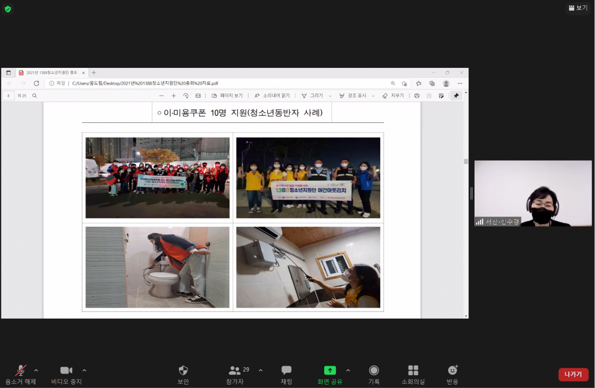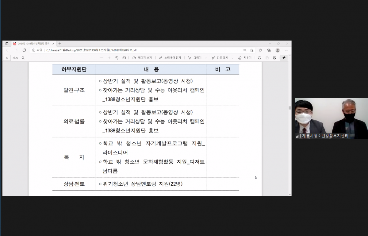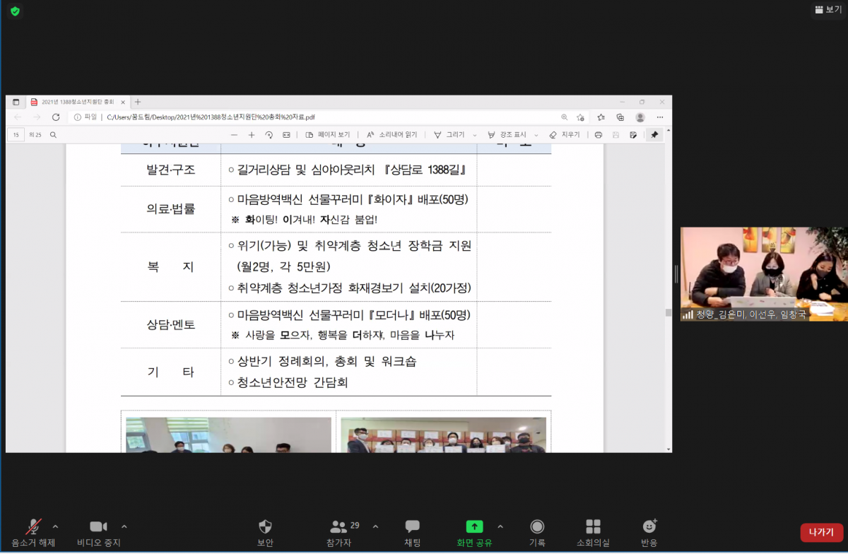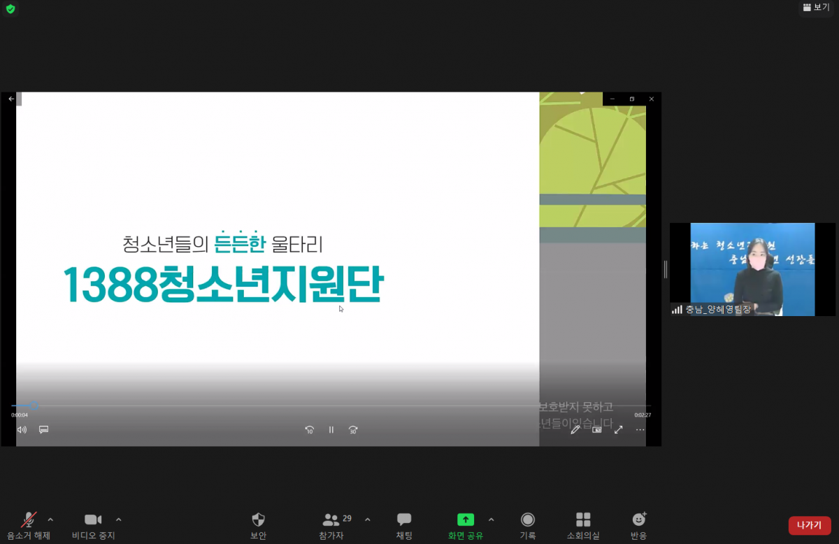 2021년 1388청소년지원단 총회&워크숍 1524 | 상담복지센터 | 2021-11-25 2021년 1388청소년지원단 총회&워크숍이 11월 24일 17시 온라인으로 진행되었습니다.코로나19로인해 비대면으로 진행되어 많은 아쉬움이 남았지만,지역 곳곳에서 따듯한 활동을 이어가고 있는 지원단분들의 소식으로 알찬 시간 되었습니다.내년에는 모두 건강한 모습으로 꼭 얼굴을 보며 함께하고 싶습니다!