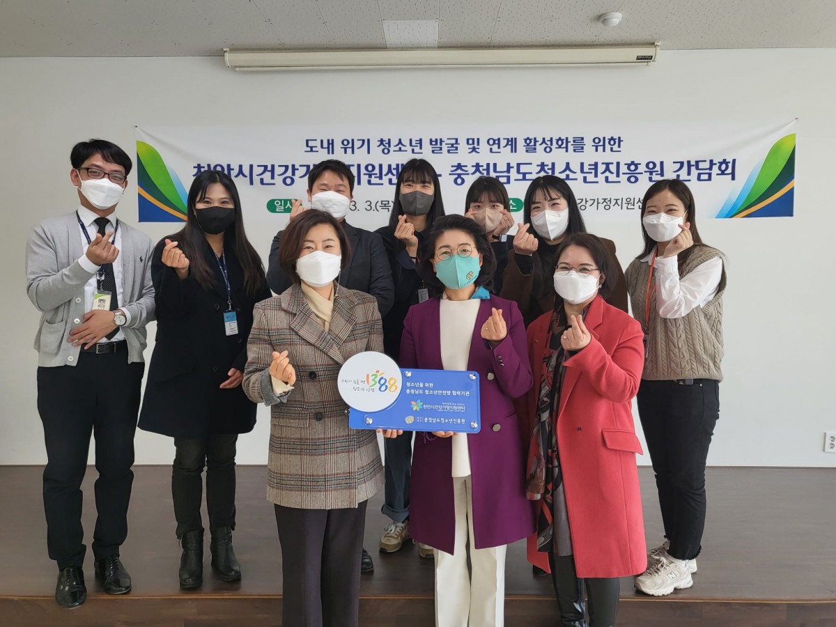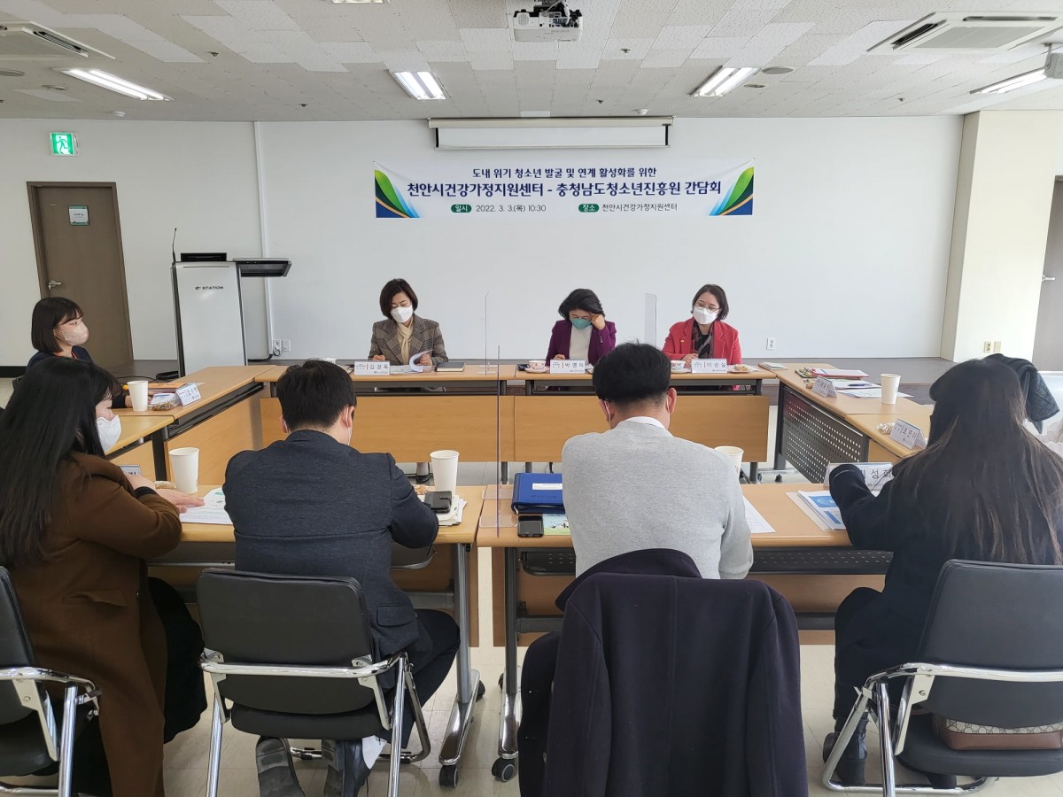 충청남도청소년진흥원-천안시건강가정지원센터 간담회 954 | 상담홍보담당자 | 2022-05-06 충청남도청소년진흥원-천안시건강가정지원센터 간담회 3월3일(목), 따뜻한 봄기운과 함께 천안시건강가정지원센터와 위기 청소년 발굴 및 연계 활성화를 위한 간담회를 개최하였습니다. 두 기관은 본 간담회를 통해 건강한 가정환경이 청소년의 건강한 성장에 영향을 줄 수 있음을 함께 공감하고 더 나아가 앞으로 사업 발전 방안들에 대해 논의하는 시간이었습니다. 청소년안전망 협력기관으로 10여년 함께 해온 천안시건강가정지원센터! 앞으로 더 기대해주세요!