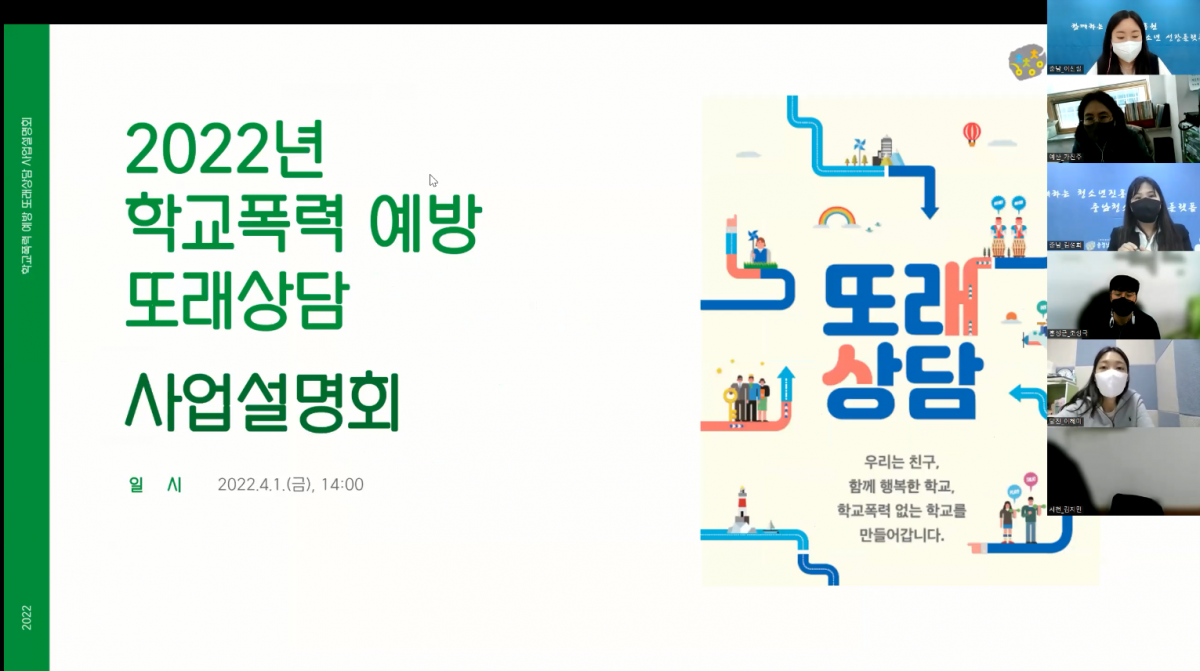 학교폭력 예방 문화 조성과 학교폭력 방어자 확대를 위한 또래상담 사업의 2022년 추진방향과 주요 변경사항 안내를 위해 사업설명회가 진행되었습니다.