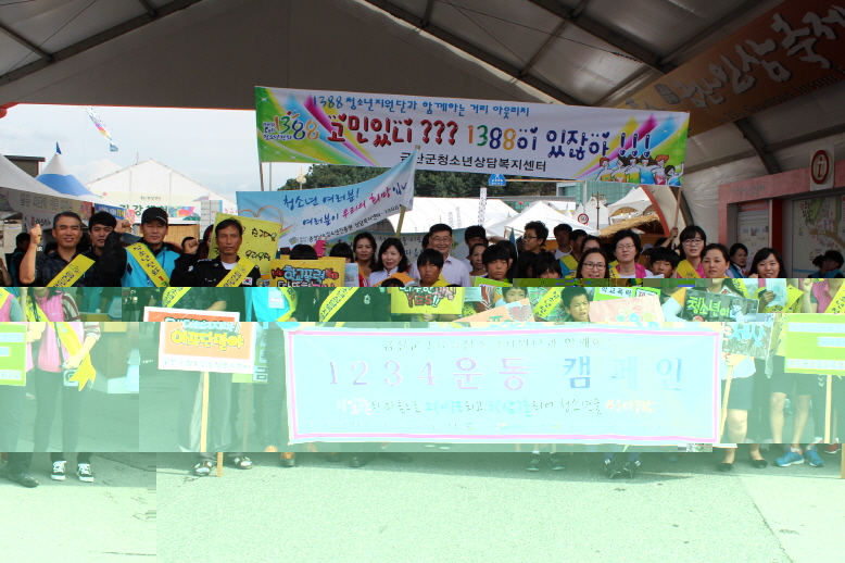 1234운동 캠페인 2차 금산지역 3333 | 최고관리자 | 2014-01-11 2013년 9월 7일 (토) 1234운동 금산지역 캠페인금산군청소년상담복지센터와 공동 운영금산군 1388청소년지원단장님을 비롯한 40여분의 1388청소년지원단 여러분께서 동참해주셨습니다.특히 지역민 뿐 아니라 외부인까지 많이 모이는 금산인삼축제 기간에 축제장에서 진행되어 큰 홍보효과를 거두었습니다,.