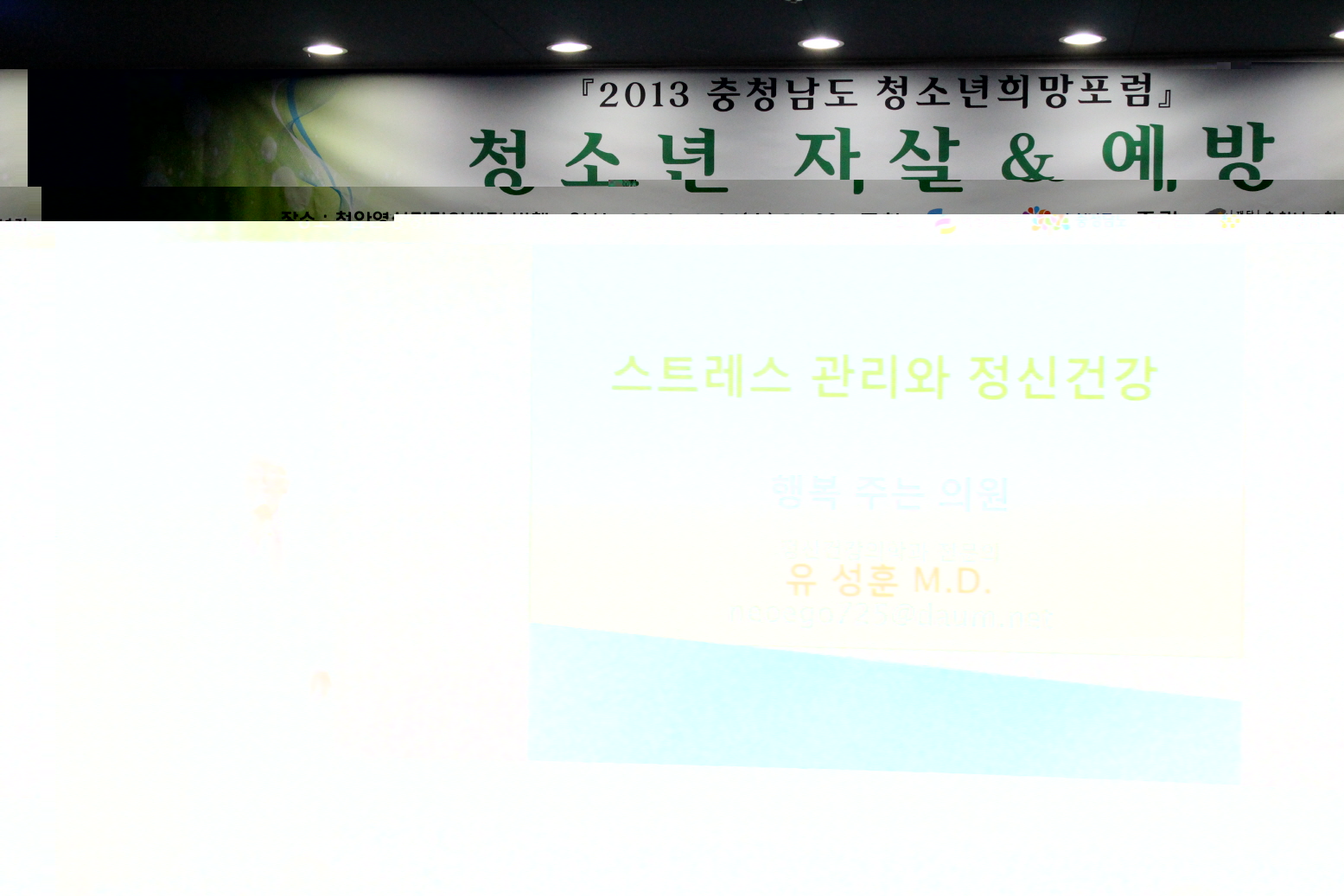 충청남도청소년희망포럼 1차 '청소년 자살&예방' 3201 | 최고관리자 | 2014-01-11 ○주제 : 청소년 자살 & 예방 ○ 일시 : 4. 24 (수요일) 14:00~16:30 ○ 장소 : 천안시영상미디어센터 비채 ○ 대상 : 학부모 및 청소년, 유관기관 관계관 등 - 발제자 : 충청남도광역정신건강증진센터 김도윤 부센터장 행복주는 의