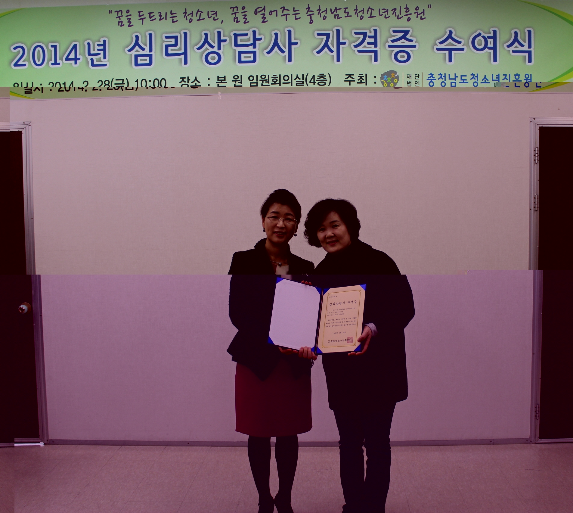 2014년 심리상담사 자격증 수여식 3621 | 최고관리자 | 2014-03-03 2014년 심리상담사 자격증 수여식 일 시 : 2014년 2월 28일(금) 10:00 장 소 : 본 원 임원회의실(4층) 내 용 : 2014년 심리상담사 자격증 수여