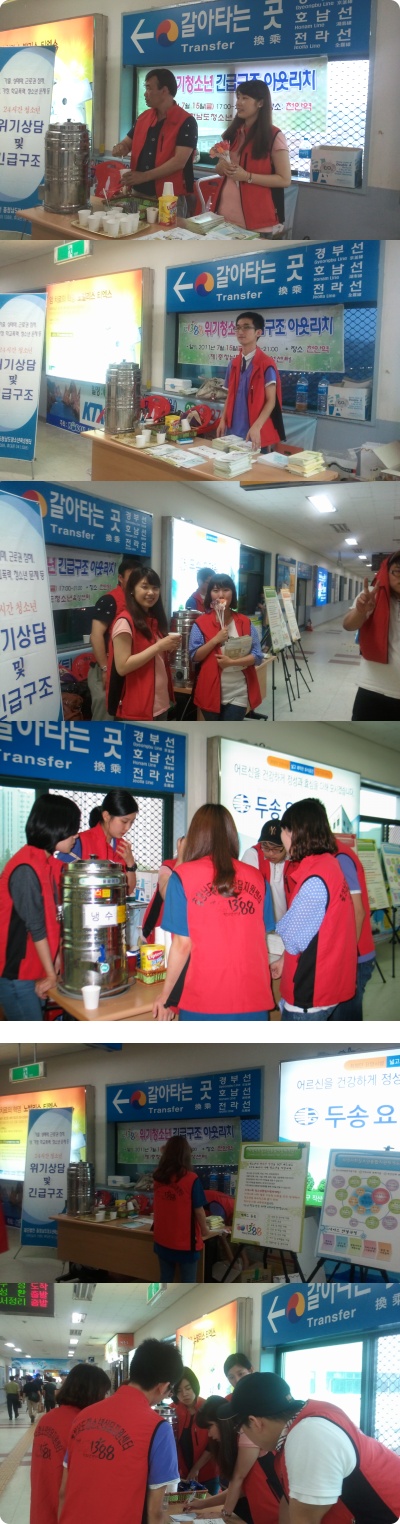 천안역 긴급구조 아웃리치 3053 | 최고관리자 | 2011-08-05 일자: 2011년 7월 15일(금) 장소: 천안역사 내 중앙통로 내용: - 위기청소년 긴급구조 안내 및 1388청소년 전화 홍보 (주면 인근 상가 및 시민 대상) - 센터 내 프로그램 안내 - 가출청소년 구호 활동 (가출청소년 대상)