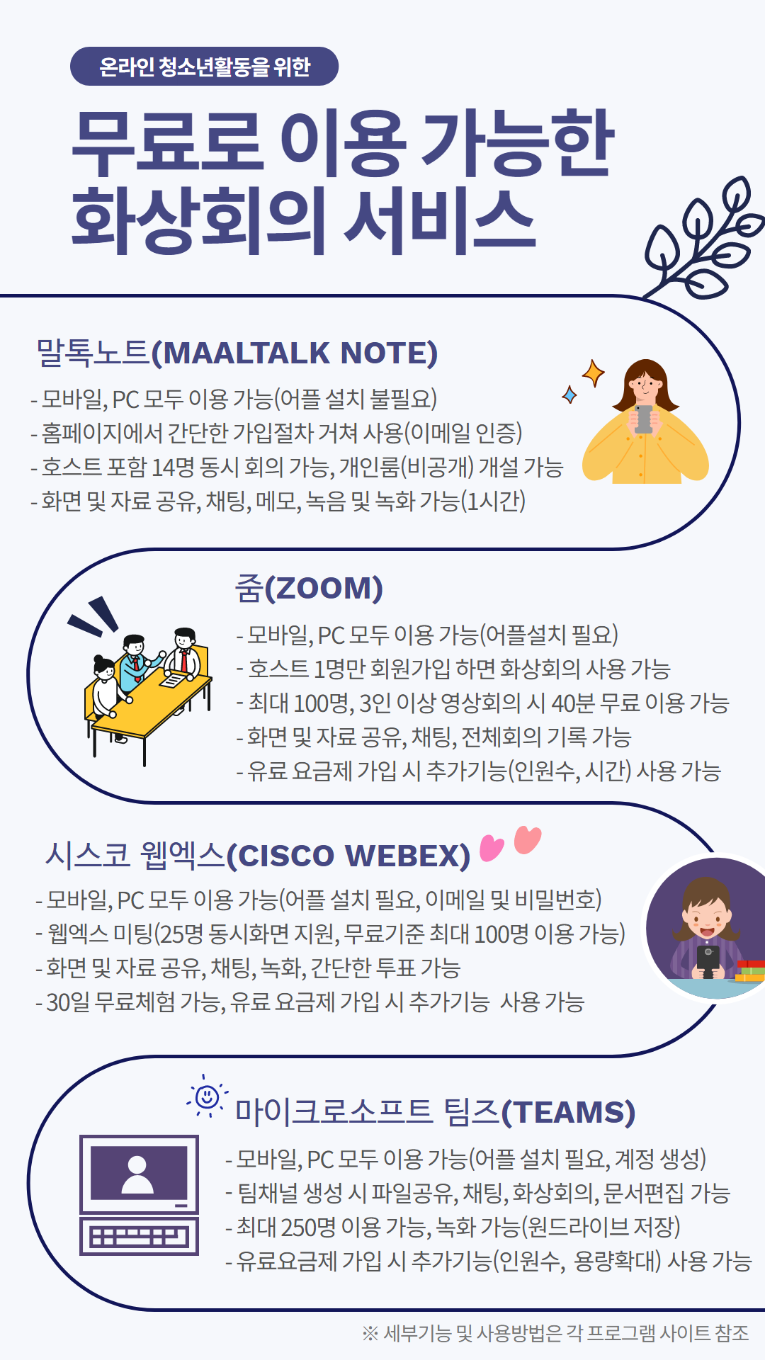 온라인 청소년활동을 위한 무료 화상회의 서비스 관련 정보 안내 1011 | 최고관리자 | 2020-04-10 2020.04.10 18:09 붙임1._화상회의_서비스_안내.hwp (1.2M) + 20 2020.04.10 18:09 온라인_청소년활동을_위한_무료_화상회의_서비스_관련_정보_안내(공문).pdf (55.8K) + 0 안녕하세요 충청남도청소년진흥원 활동진흥센터입니다. 본원 청소년활동진흥센터에서는 최근 코로나19 바이러스 확산으로 인한 사회적 거리두기가 장기화됨에 따라 온라인 청소년활동에 필요한 무료 화상회의 서비스 관련 정보를 조사하여 붙임과 같이 안내드립니다. 본원에서 조사한 결과를 바탕으로 작성한 부분이라 부족한 점이 있을지 모르지만오랜 휴관으로 인해 청소년 활동 프로그램 운영이 어려우신 선생님들께 조금이나마 도움이 되는 정보였으면 합니다^^