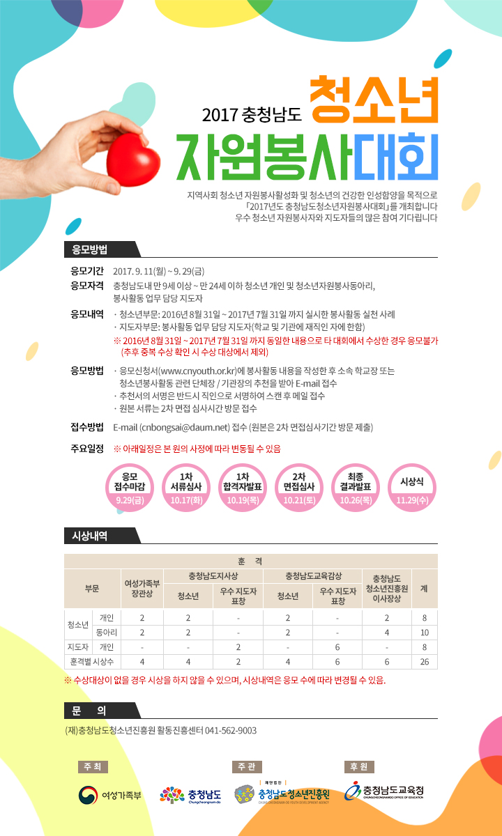 2017년도 청소년자원봉사대회 공모 안내 3167 | 최고관리자 | 2017-09-12 2017.09.12 11:05 [붙임1]_2017년도_충청남도청소년자원봉사대회_공고.pdf (131.2K) + 0 2017.09.12 11:05 [붙임2]_2017년도_충청남도청소년자원봉사대회_공모신청서_양식.hwp (30.5K) + 6 재단법인 충청남도청소년진흥원 공고 제2017-66호(2017.9.8.) 2017년 청소년자원봉사대회에 많은 청소년 및 지도자의 참여 바랍니다^0^자세한 사항은 아래 첨부파일 확인부탁드립니다.