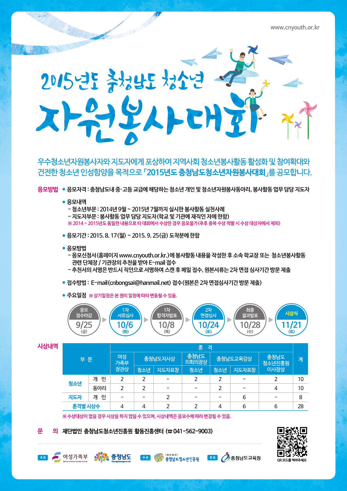 [공고] 2015년도 충청남도청소년자원봉사대회 공모 공고 2736 | 최고관리자 | 2015-08-11 2015.08.11 15:19 2._공모신청서_양식(2015).hwp (28.0K) + 7 2015.08.11 15:19 1._공고문(2015).pdf (62.1K) + 0 재단법인 충청남도청소년진흥원 공고 제2015-35호(2015.8. 11) 2015년도 충청남도청소년자원봉사대회를 다음과 같이 공모하오니, 많은 청소년들의 참여를 부탁드립니다.