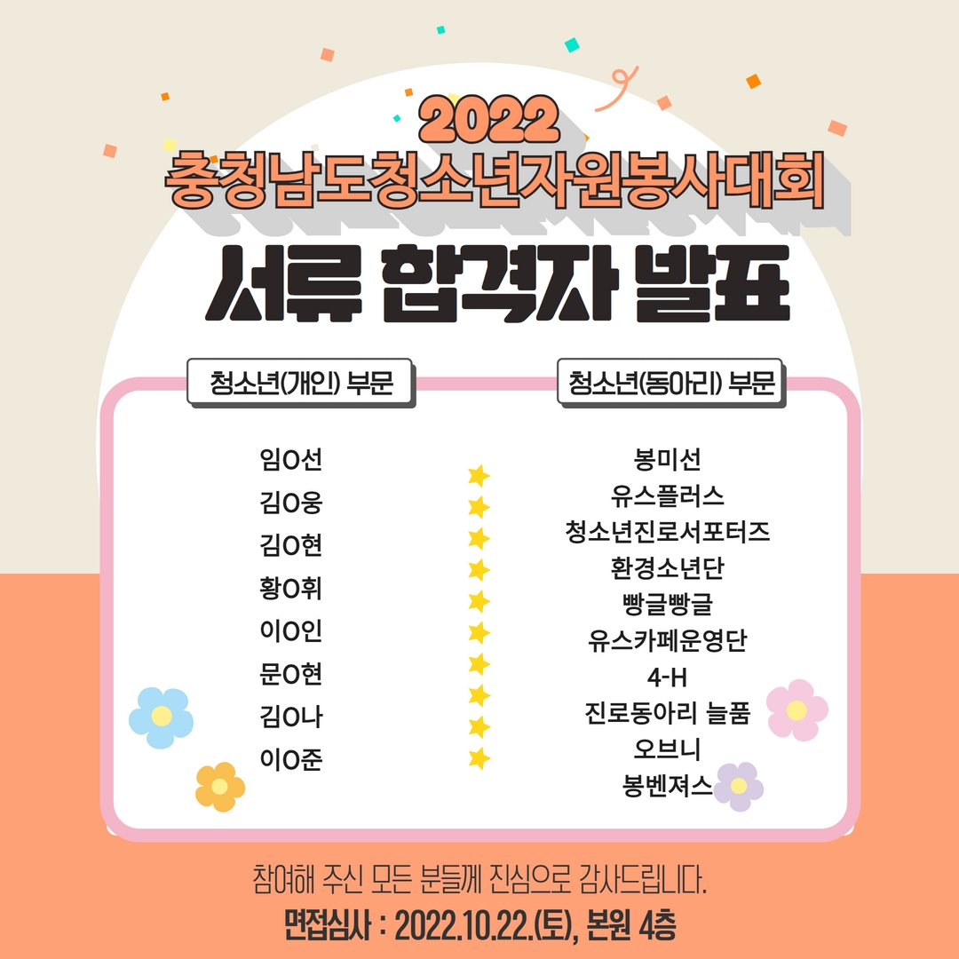 [안내] 2022 충청남도청소년자원봉사대회 서류 합격자 및 면접심사 안내