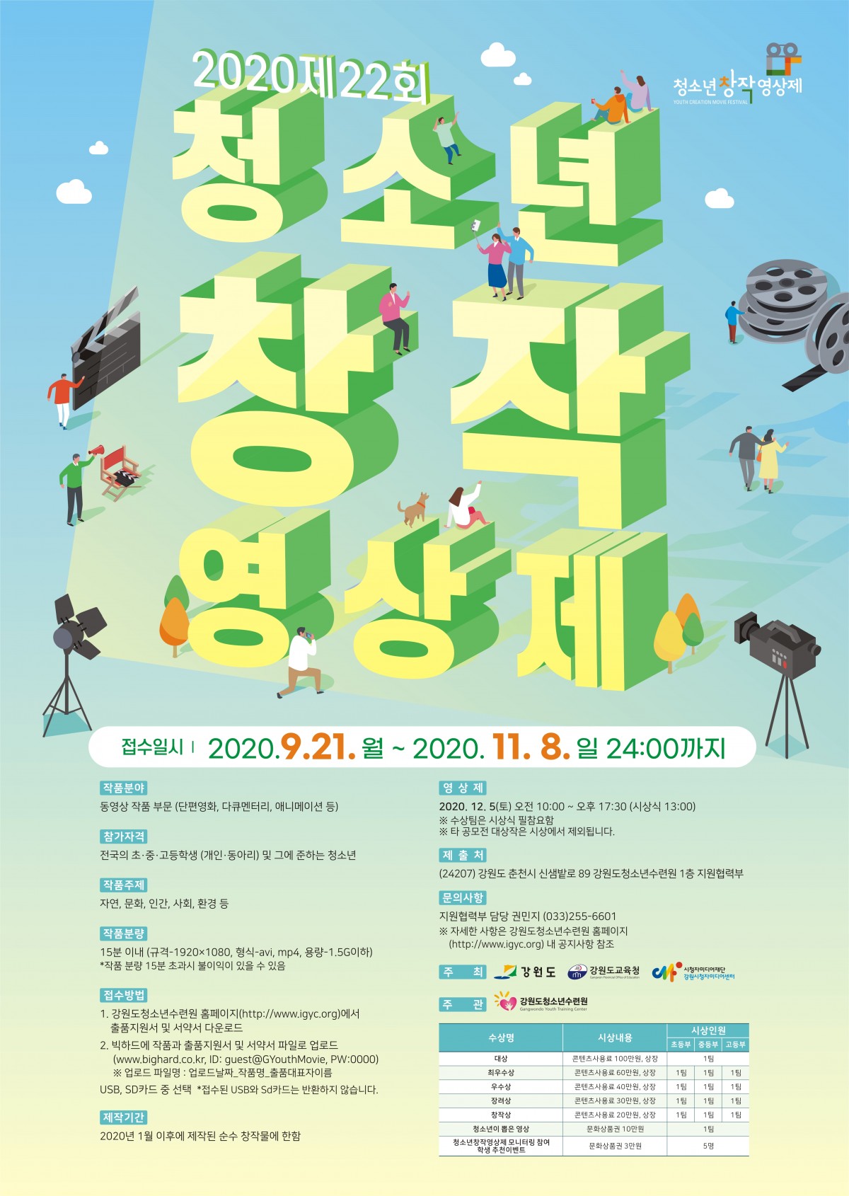 2020 제22회 청소년창작영상제 멀티미디어 문화에 대한 이해와 청소년들의 진취적 창작의욕을 고취시키고 멀티미디어 전문기능향상으로 청소년들의 차세대산업 주도능력 향상을 위해 청소년창작영상제가 운영됩니다.