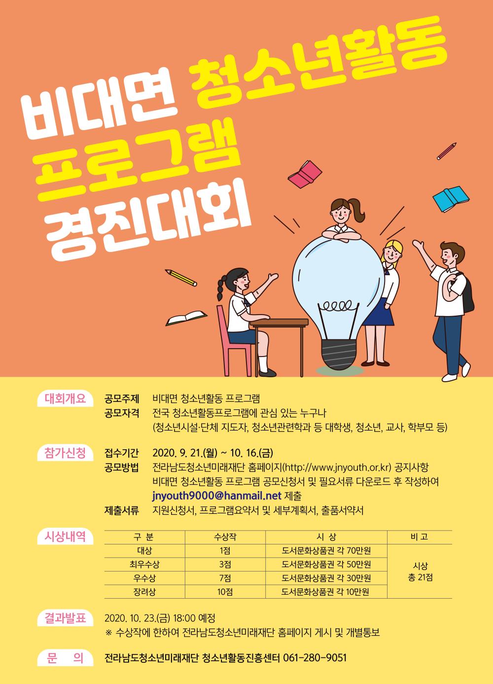 (홍보) 비대면 청소년활동 프로그램 경진대회 안내 2379 | 최고관리자 | 2020-10-14 2020.10.14 16:52 비대면청소년활동프로그램안내및제출서식.hwp (31.5K) + 18 전라남도청소년미래재단 청소년활동진흥센터에서 '비대면 청소년활동 프로그램 경진대회'를 진행한다고 합니다. 비대면 청소년활동 프로그램 경진대회를 통해 청소년현장에서 활용할 수 있는 우수한 비대면 청소년활동 프로그램을 발굴하고 보급하여 코로나 19 이후 변화된 청소년활동에 대비하고, 새로운 패러다임 환경에 적응할 수 있도록 지원하고자 다음과 같이 비대면 청소년활동 프로그램 경진대회를 진행한다고 하니 많은 관심과 참여 부탁드립니다 :)