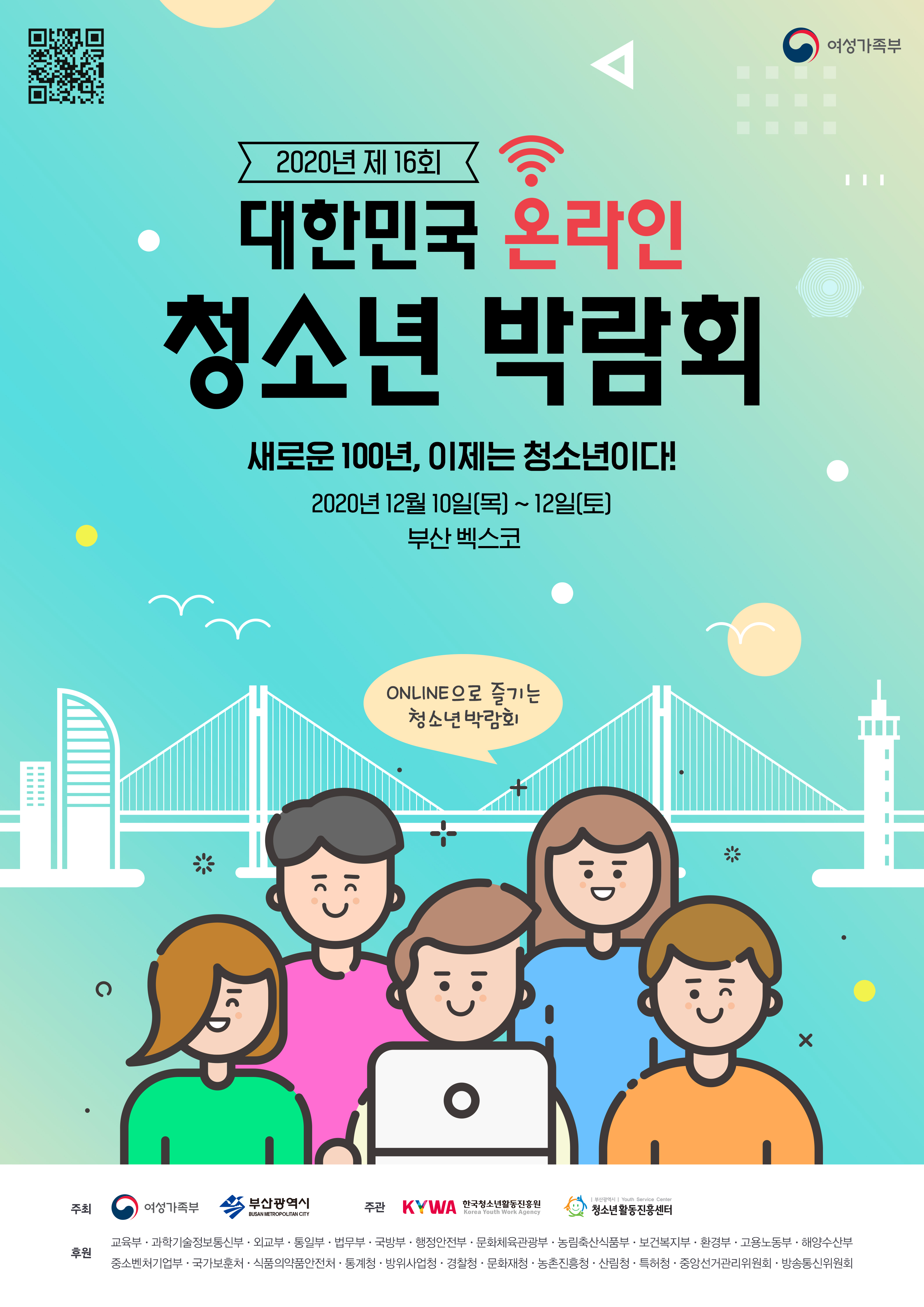 (홍보) 2020년 대한민국 청소년 박람회 안내 2338 | 최고관리자 | 2020-11-26 2020.11.26 10:24 2020년_대한민국_청소년_박람회.hwp (6.6M) + 19 제 16회 대한민국 청소년 박람회 기 간 : 2020. 12. 10.(목) ~ 12. 12.(토) 3일간 개최 주 최 : 여성가족부, 부산광역시 공동주최 주요 일정 : 박람회 홈페이지 및 유튜브 등을 통해 송출 (해당 시간 최초 송출 후 박람회 기간 동안 홈페이지 상시 게시) *일부 강의 및 체험 프로그램은 미리 신청한 청소년만 관람 가능합니다. 기타 자세한 내용은 첨부파일을 참고해주세요