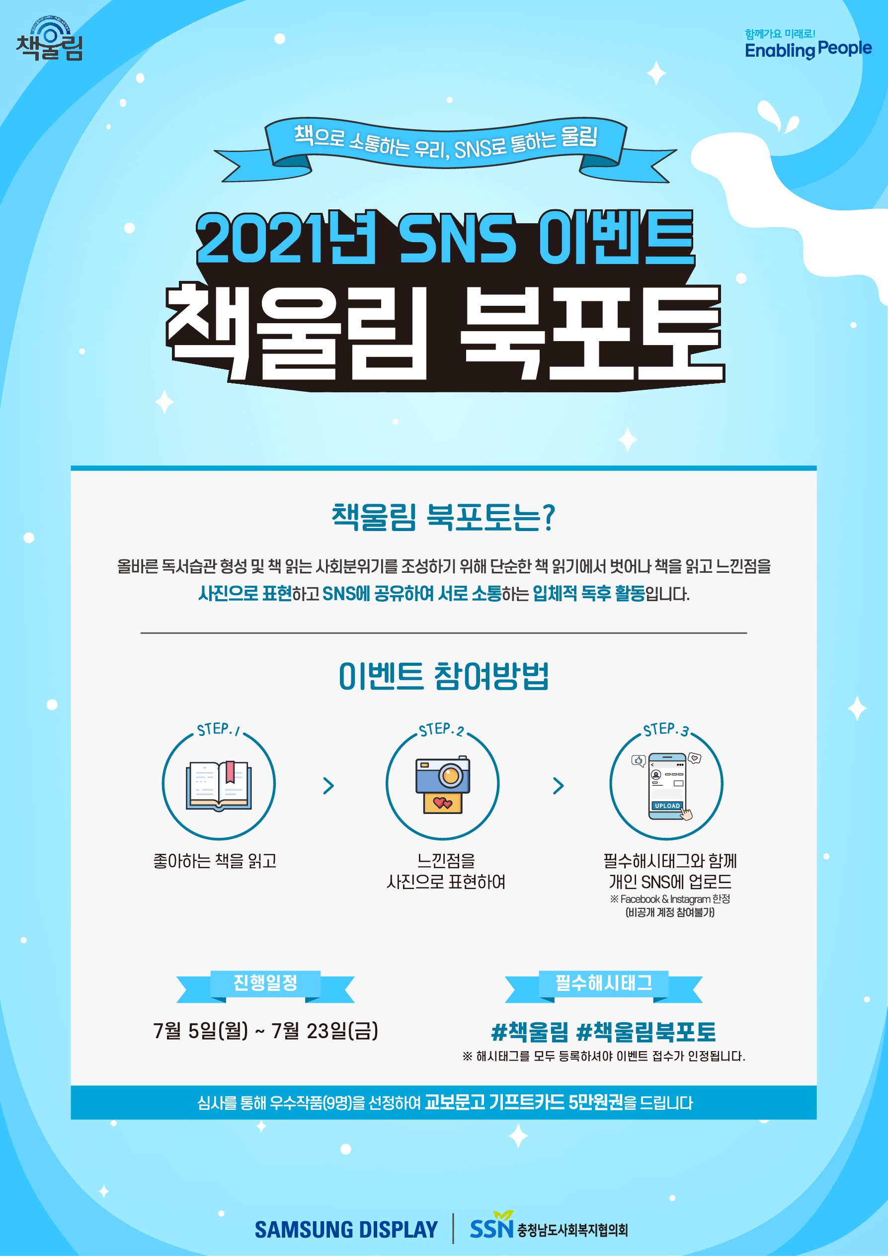 접수방법: 감명 깊게 읽은 책을 "사진"으로 공유하고, "필수해시태그"와 함께 SNS에 업로드