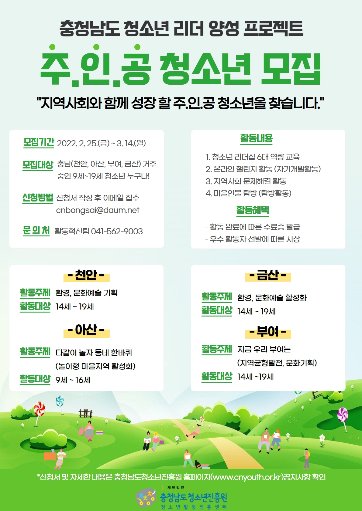 [모집] 2022 충청남도 청소년 리더 양성 프로젝트 주.인.공 청소년 모집 안내