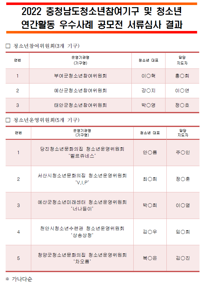 [안내] 2022 충청남도청소년참여기구 및 청소년 연간활동 우수사례 서류심사 결과 및 인터뷰 심사 안내