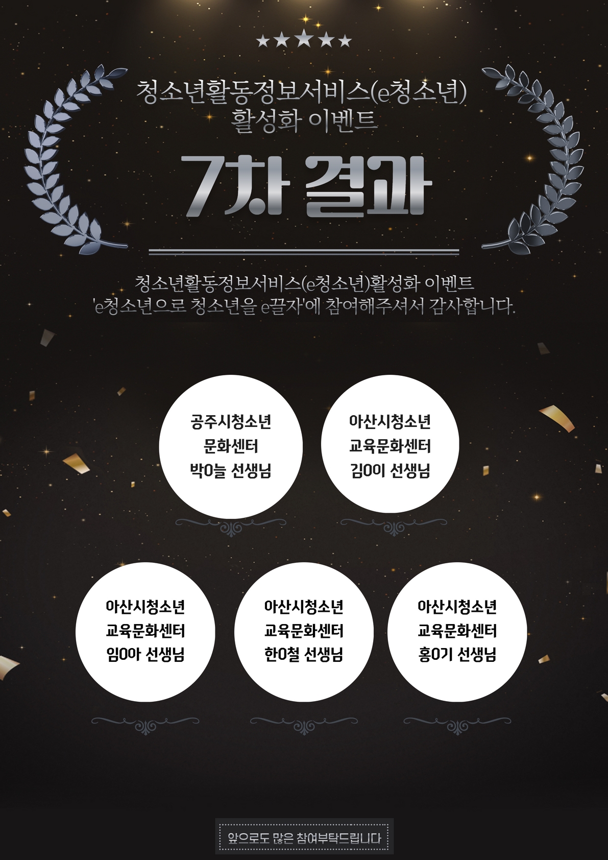 [안내] 청소년활동정보서비스(e청소년) 7차 이벤트 결과 2176 | 활동진흥센터 | 2022-12-06 안녕하세요. 활동진흥센터입니다 !어느덧 마지막 이벤트 결과를 발표하게 되었습니다.선정되신 선생님들께는 개별 연락 드릴예정입니다.그동안 청소년활동정보서비스(e청소년)에 많은 관심 주셔서 감사드리며, 앞으로도 e청소년을 통해 청소년들에게 다양한 정보 제공 부탁드립니다 ! ( •̀ ω •́ )✧남은 연말도 행복하시길 바라고, 눈길 이동 조심하세요.감사합니다.