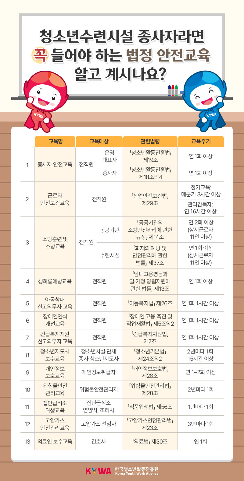 교육명과 교육 대상, 교육 주기 별로 정리되어있으니, 안전한 청소년 활동을 위해 꼭 확인해주세요!