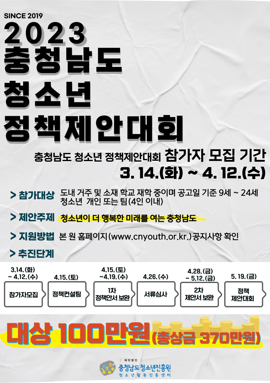 「2023년 충청남도 청소년정책제안대회」참가자를 모집하오니 도내 청소년들의 많은 참여 바랍니다.