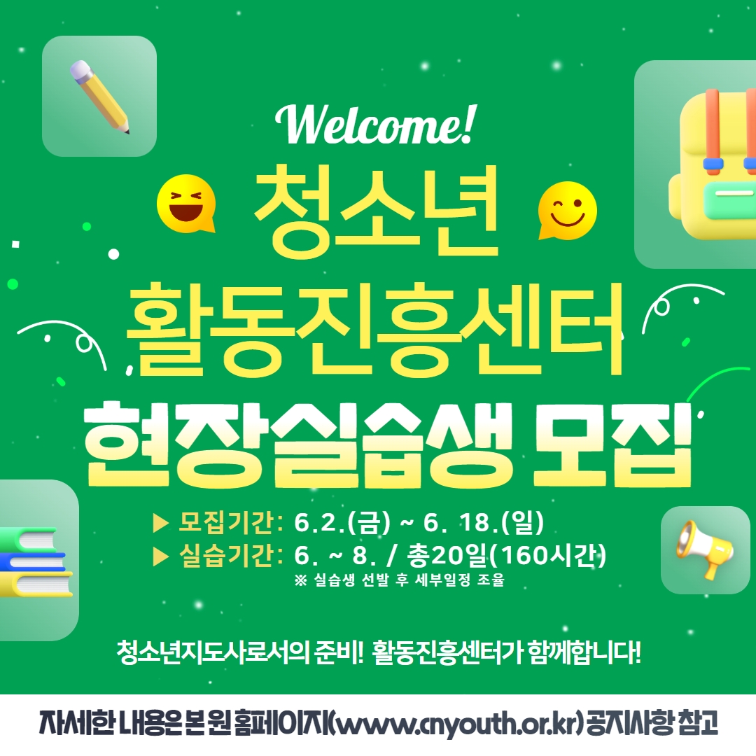 청소년지도사 현장 실습생을 모집하오니 많은 관심과 신청 바랍니다.