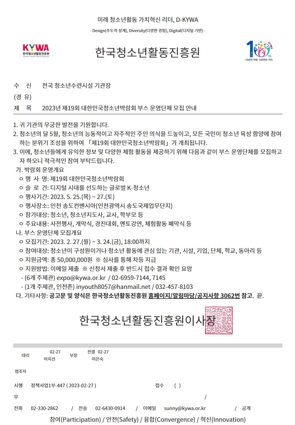한국청소년활동진흥원에서 진행하는 「2023년 제19회 대한민국청소년박람회」에서 체험 부스를 운영할 단체를 모집합니다.
