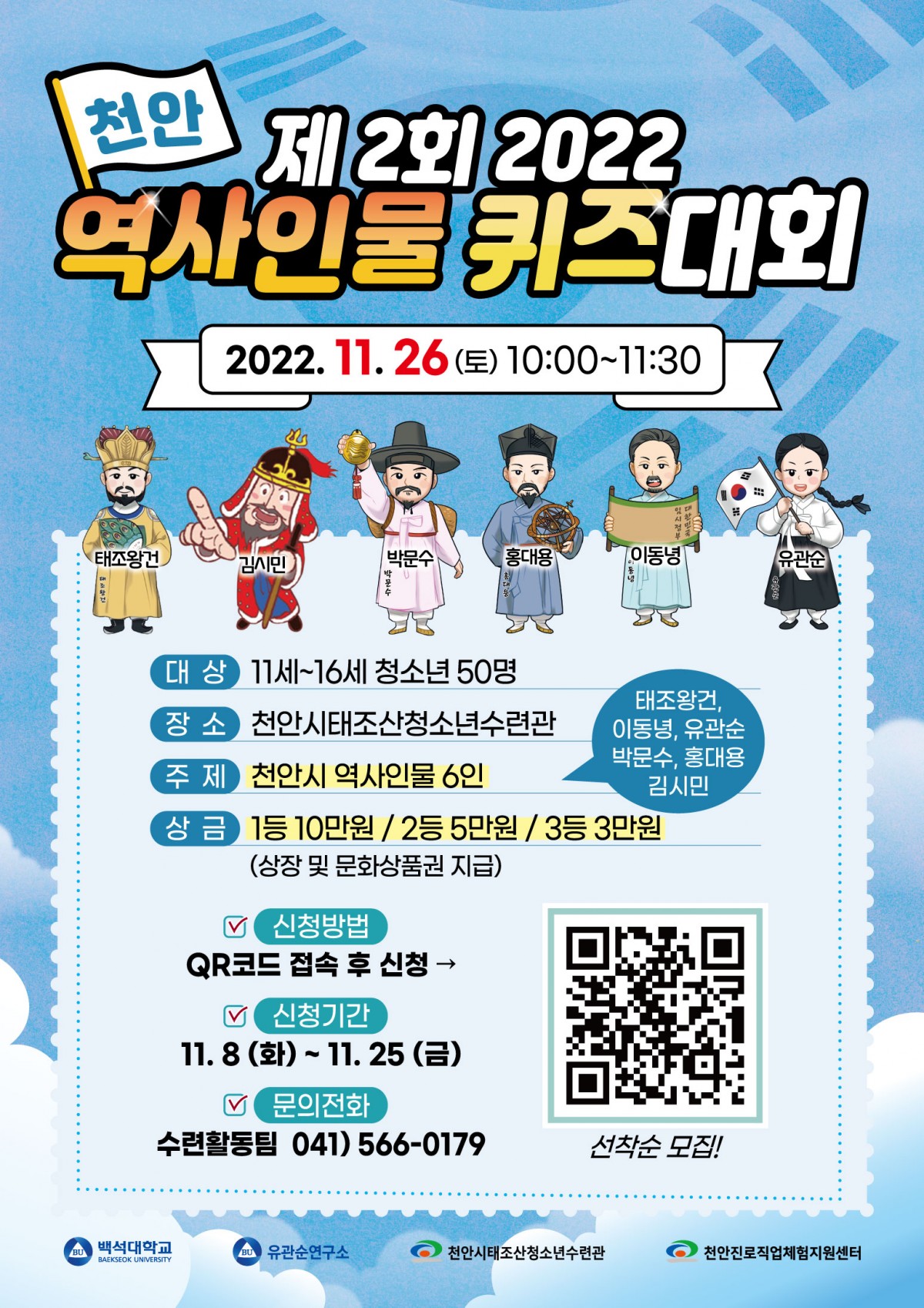 [천안시태조산청소년수련관]2022 제2회 천안역사인물 퀴즈대회 1491 | 활동진흥센터 | 2022-11-17 활동목표 및 상세내용2022 제2회 천안역사인물 퀴즈대회대상 : 11~16세 청소년 50명장소 : 천안시태조산청소년수련관주제 : 천안시 역사인물 6인 (태조왕건, 이동녕, 유관순, 박문수, 홍대용, 김시민)