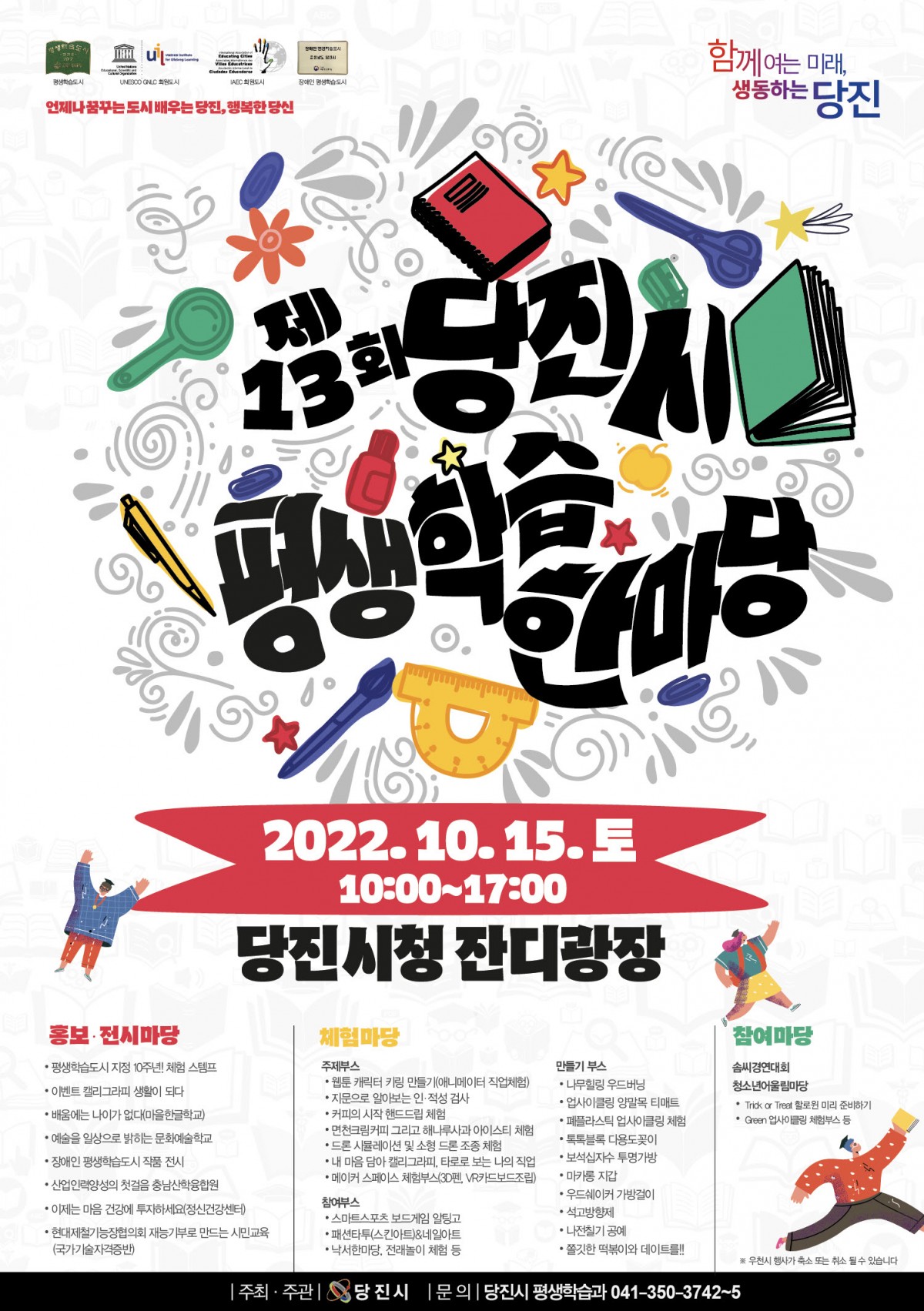 [당진시청소년문화의집] 2022년 평생학습한마당 연계 4차 당진청소년어울림마당 1485 | 활동진흥센터 | 2022-10-11 https://www.youth.go.kr/youth/act/actSearch/actSearchDtl.yt?sCrtfcText… + 1024 활동개요일시 : 2022년 10월 15일 오후 1시~장소 : 당진시청 일대내용 : 체험마당(양말목공예, 붕어빵만들기, 홀랜드 직업검사, 멸종위기동물보호 굿즈 판매, 할로윈미리 즐기기 등) 활동마당(보물찾기)활동목표 및 상세내용청소년의 문화·예술 전용공간인 청소년어울림마당과 당진시평생학습대축제 연계를 통해 다채로운 체험·공연프로그램을 제공 및 청소년들의문화감수성 함양하고 지역사회 연계를 통한 상호교류의 장을 마련하고자 함.