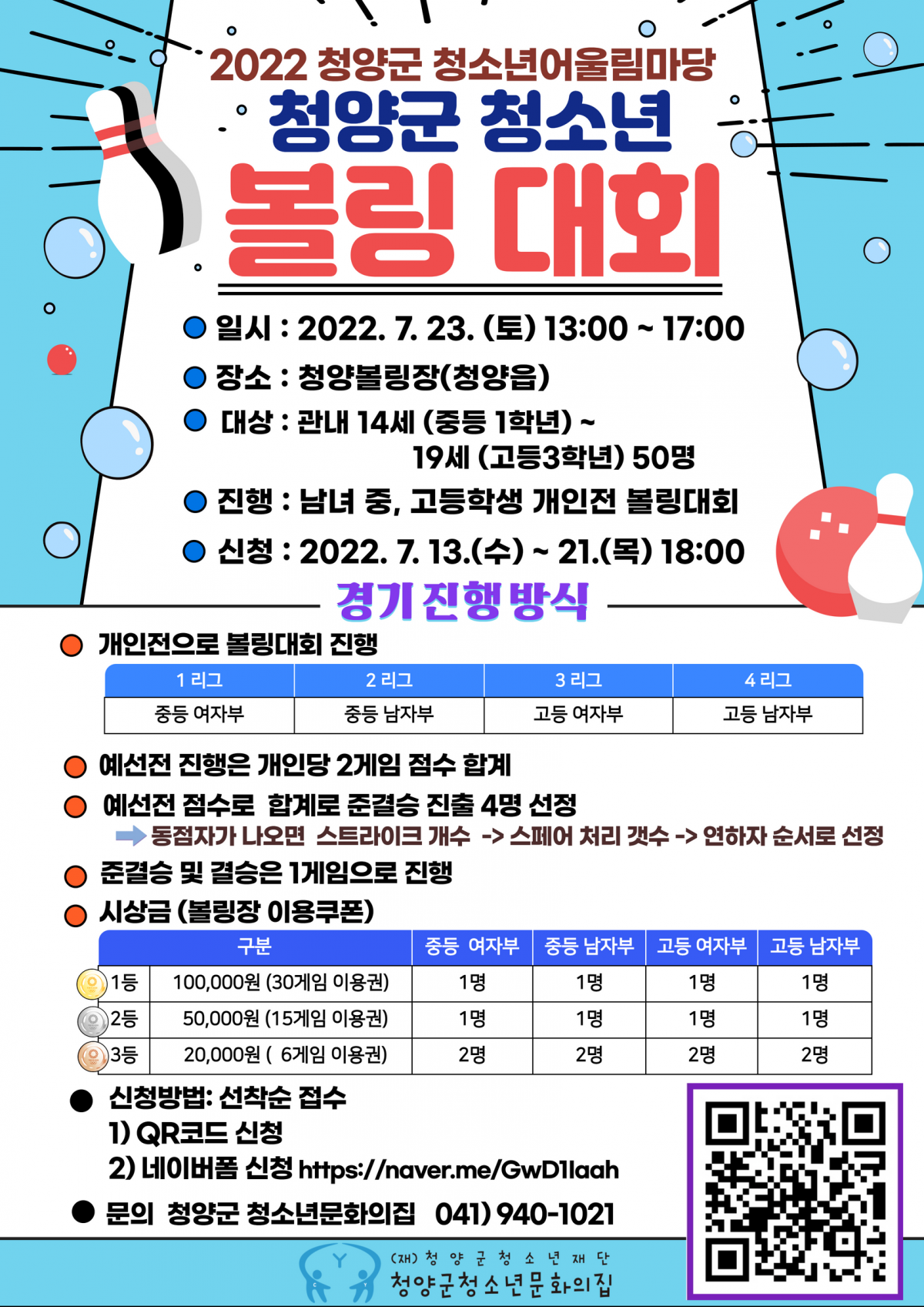 2022 청양군 청소년 어울림마당 2차 " 2022 청양군 청소년 볼링 대회" 관내 14세 ~ 19세 청소년 50명 참가, 남녀 중고등학생 개인 볼링 대회