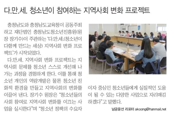 다.만.세. 청소년이 참여하는 지역사회 변화 프로젝트 2379 | 최고관리자 | 2017-06-19 https://webzine.localnaeil.com/ecatalog5.asp?Dir=9104 + 894 2017. 6. 22. 천안아산내일신문 1234호 22면