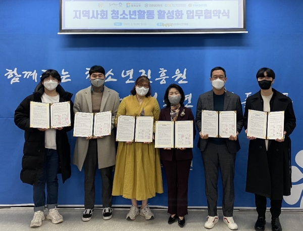 충청남도청소년진흥원(원장 박영의, 이하 진흥원)은 지난 10일 천안시 서북구 두정동에 위치한 진흥원 교육장에서 지역사회 청소년 활동 활성화를 위해 충남사회경제네트워크(이사장 신재학)와 업무협약을 맺었다. 이날 협약식에는 청소년들과 직접 활동을 진행할 사회적기업(교육공동체협동조합 노리아이, ㈜동네형아, 들락날락 협동조합, ㈜옵저브) 대표들이 함께 참여하였다.