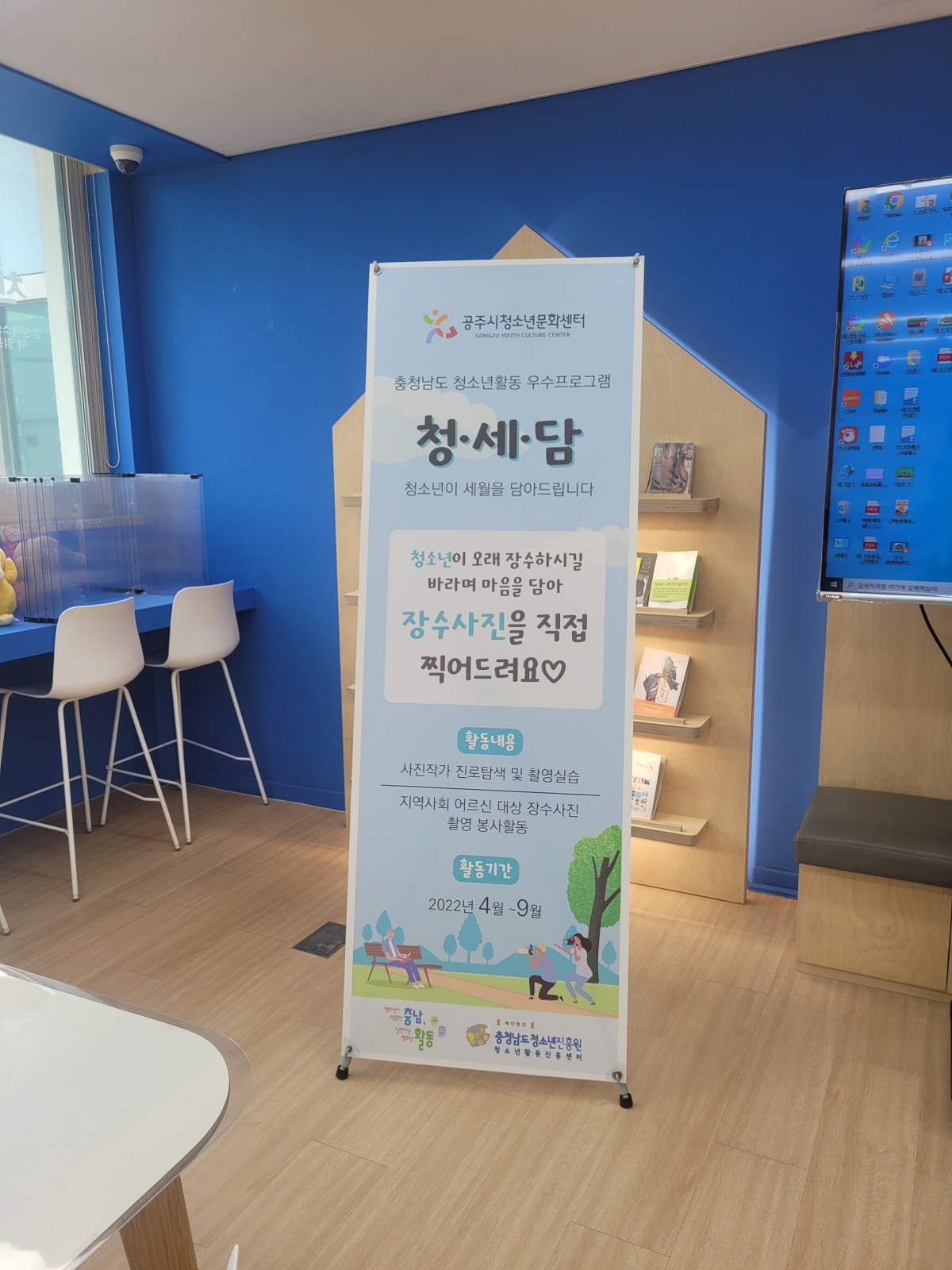 충청남도 청소년활동 우수 프로그램 전문가 현장 컨설팅(공주시청소년문화센터) 1921 | 활동진흥센터 | 2022-07-28 충청남도 청소년활동 우수 프로그램 '청.세.담.(청소년이 세월을 담아드립니다.)' 전문가 현장 컨설팅이 7.23.(토) 공주시청소년문화센터에서 진행됩니다. '청.세.담.(청소년이 세월을 담아드립니다.)' 는 청소년과 어르신이 프로그램을 매개로 모여 함께 활동함으로써 세대 간 소통 및 교류를 하고자 합니다. 그래서 청소년들이 지역 내 사진작가를 통해 진로탐색을 하고, 촬영실습을 통한 기본적인 기술을 습득하여 나아가 지역사회 어르신을 대상으로 장수사신 촬영을 하는 봉사활동 프로그램 입니다.