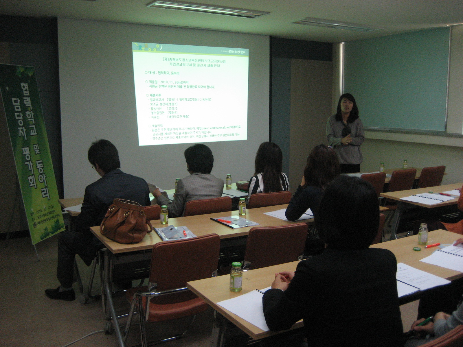 협력학교 및 동아리 담당자 평가회 4483 | 최고관리자 | 2010-11-01 (재)충청남도청소년육성센터에서는 '학교와 센터간의 연계협력' 과 '리더쉽봉사단 개발 운영'사업의 일환으로 10월 22일(금) 공주시청소년문화센터에서 "협력학교 및 동아리 담당자 평가회'를 가졌습니다.