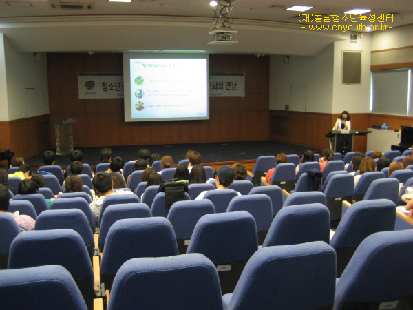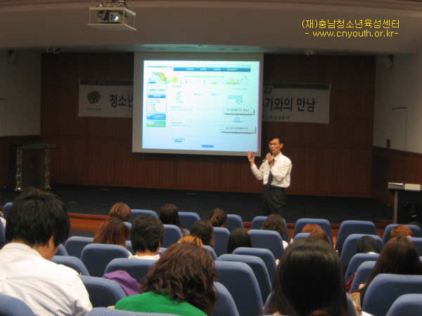 예비청소년지도자특강 실시(호서대) 4397 | 최고관리자 | 2011-05-20 5월 18일(수) 오후 5시호서대학교 청소년문화*상담학과 전학년 94명과 함께「청소년정책환경 변화에 따른 현장전문가와의 만남」이란 제목으로 한국청소년활동진흥원 오재법 부장님을 모시고 특강을 진행하였습니다.센터 및 활동지원실 사업설명과 함께 진행되었습니다.