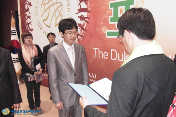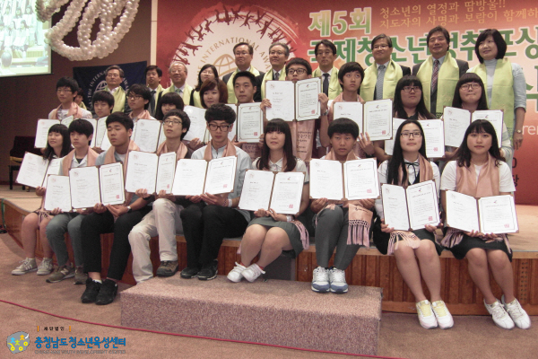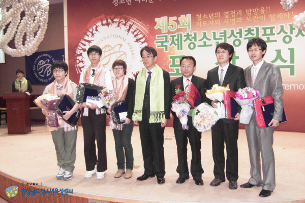 제5회 국제청소년성취포상식 4406 | 최고관리자 | 2011-06-21 제5회 국제청소년성취포상식서 충남도내 우수지도자(여성가족부장관상) 수상 및 청소년(동장) 6명 포상 등 ※사진 설명첫번째,두번째 사진 - 여성가족부 장관상을 수상하는 道 청소년육성센터 활동지원실 김영이 팀장세번째 사진 - 여성가족부장관상을 수상한 청소년육성센터 김영이 팀장(맨 우측)과 논산대건고 한우진 선생님(우측에서 두 번째)네번째 사진 - 제5회 국제청소년성취포상제 동장 포상을 받는 충청남도 청소년(두번째줄 우측 첫 번째 두 번째 첫 번째 줄 좌측 첫번째