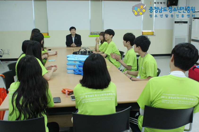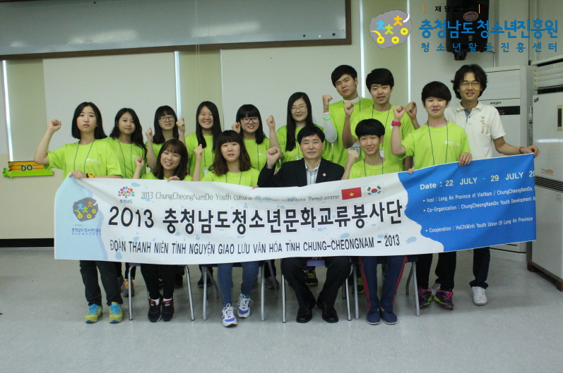 2013년 충청남도청소년문화교류봉사단 출발! 4535 | 최고관리자 | 2013-07-30 2013년 충청남도청소년문화교류봉사단이 7월 22일 베트남 롱안성으로 떠났답니다 ^^바쁜 와중에도 틈틈히 모여서 많은 준비를 한 우리 봉사단 친구들 이제 실력을 발휘하러 출발~!몸 조심히 다녀오고 베트남친구들과 좋은 추억 많이 만들고 오길 바래요~