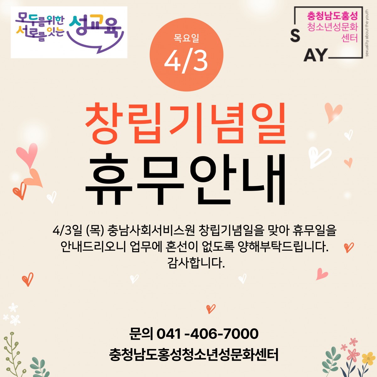2025년 4월 3일 목요일 창립기념일을 맞아 휴무일은 안내드립니다.