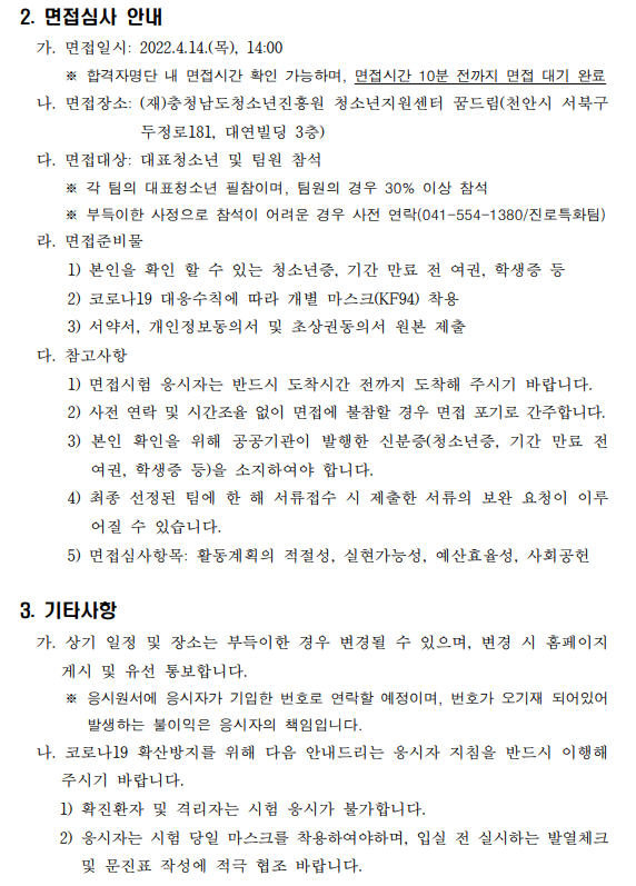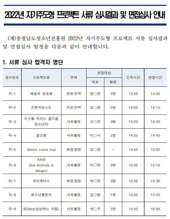 2022년 자기주도형 프로젝트 서류 심사결과 및 면접심사 안내