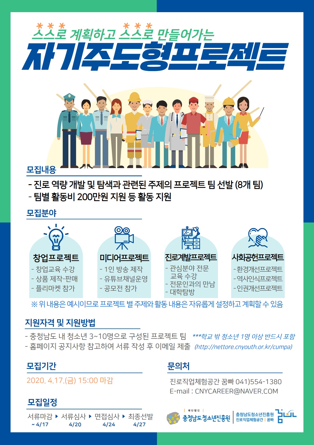 - 자립지원팀 자기주도형프로젝트 담당자 김선혁 ☎ 041)554-1380
