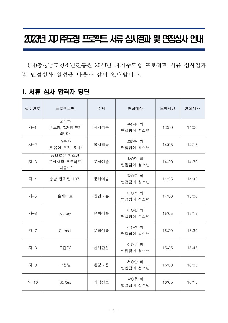 자기주도형 프로젝트 서류 심사결과 및 면접심사 일정을 다음과 같이 안내드립니다.