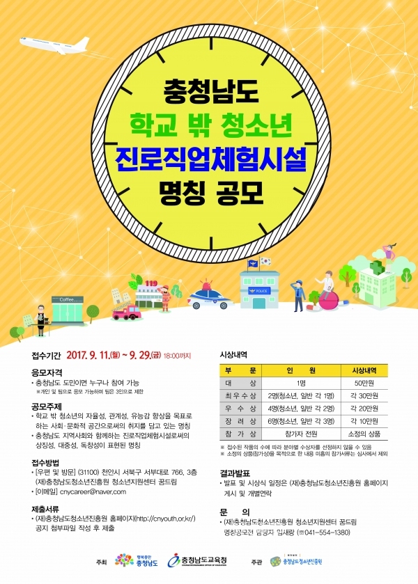 재단법인 충청남도청소년진흥원(원장 장기수)은 충남도청과 충남교육청의 교육상생협력사업의 일환인 「학교 밖 청소년 진로직업체험시설」의 명칭을 공모전을 통해 선정한다고 밝혔다.