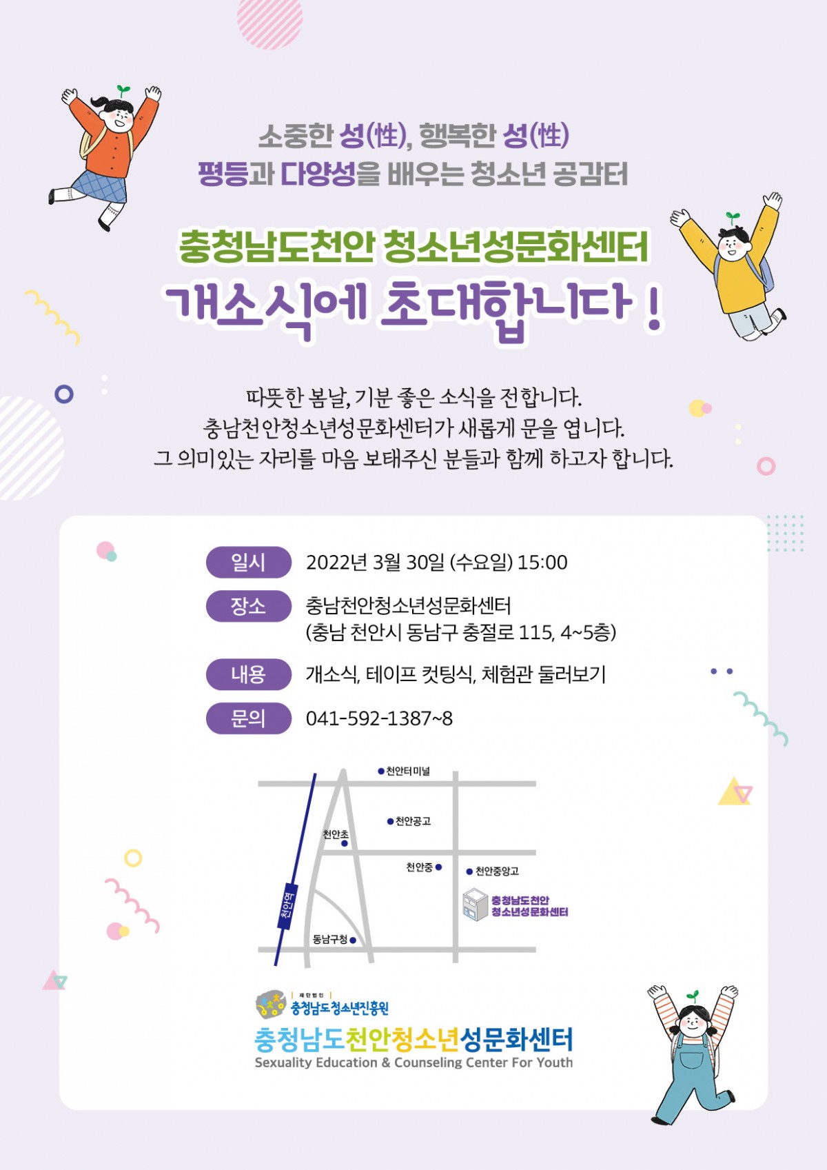 충청남도천안청소년성문화센터 개소식 안내 1727 | 천안성문화센터 | 2022-03-24 작년부터 진행되었던 천안성문화센터 이전설치 공사가 드디어 완수되었습니다.그동안 마음 보태주신 귀한 분들을 모시고 개소식을 진행하려고 초대장을 드립니다.