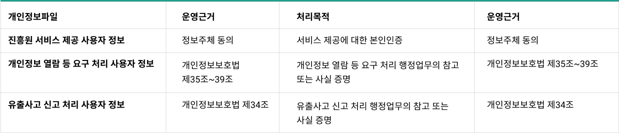 - 나. 민원처리 개인정보 열람, 개인정보 정정·삭제, 개인정보 처리정지 요구, 개인정보 유출사고 신고 등 개인정보와 관련된 민원처리를 목적으로 개인정보를 처리합니다.
